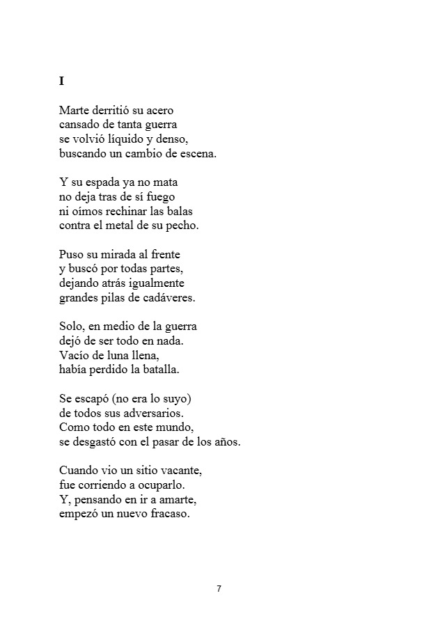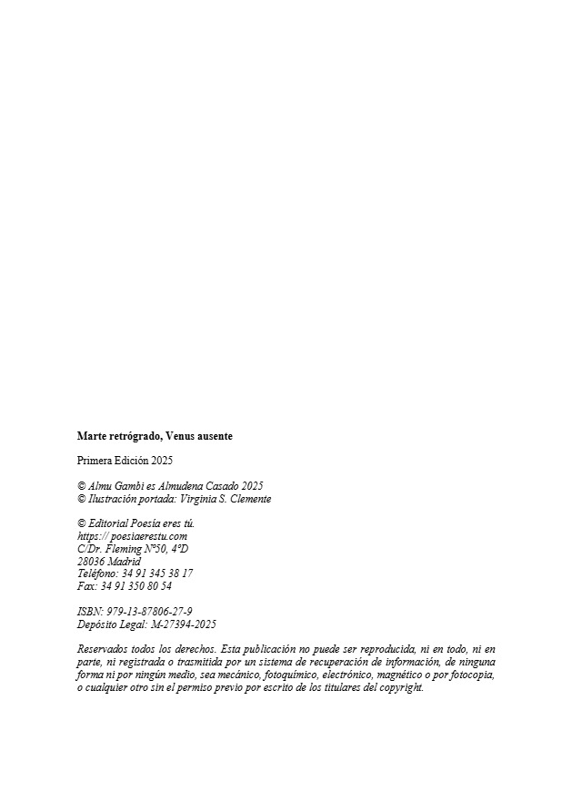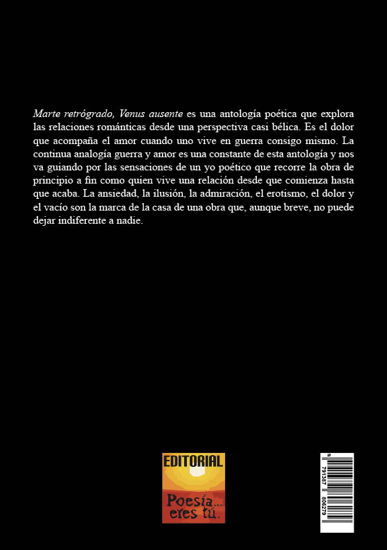Marte retrógrado, Venus ausente es una antología poética que explora las relaciones románticas desde una perspectiva casi bélica. Es el dolor que acompaña el amor cuando uno vive en guerra consigo mismo. La continua analogía guerra y amor es una constante de esta antología y nos va guiando por las sensaciones de un yo poético que recorre la obra de principio a fin como quien vive una relación desde que comienza hasta que acaba. La ansiedad, la ilusión, la admiración, el erotismo, el dolor y el vacío son la marca de la casa de una obra que, aunque breve, no puede dejar indiferente a nadie.