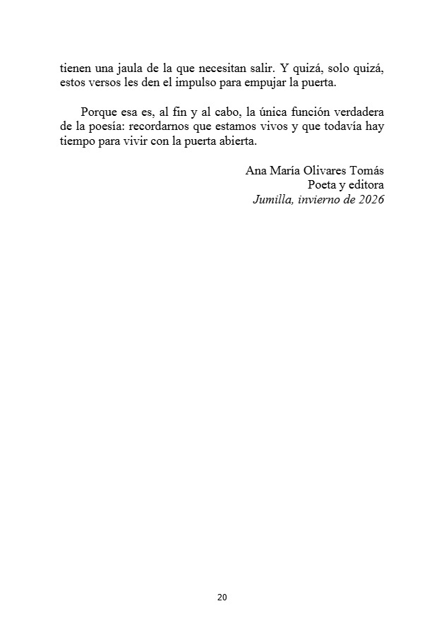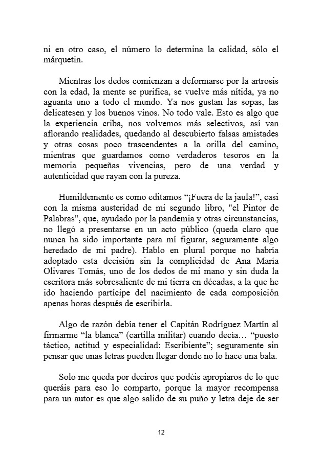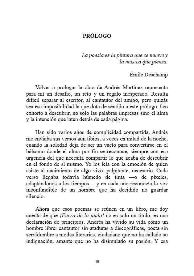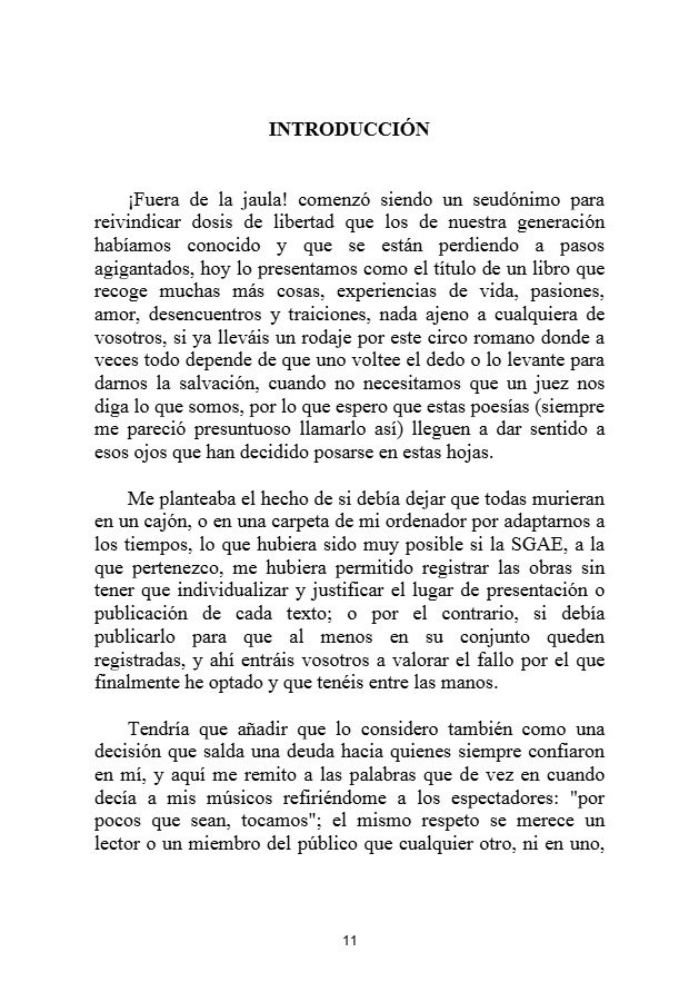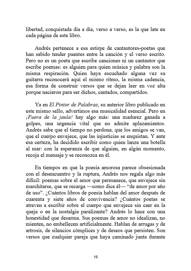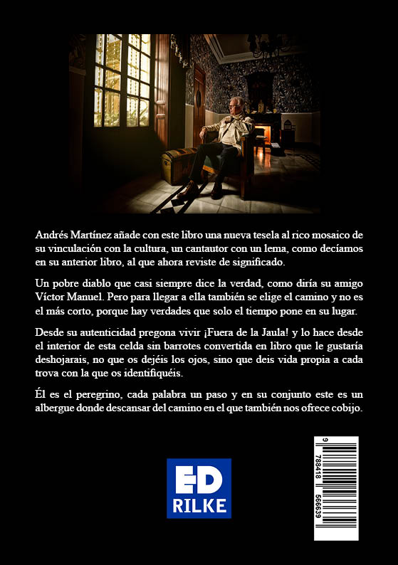 Desde su autenticidad pregona vivir ¡Fuera de la Jaula! y lo hace desde el interior de esta celda sin barrotes convertida en libro que le gustaría deshojarais, no que os dejéis los ojos, sino que deis vida propia a cada trova con la que os identifiquéis.