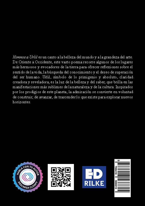Himnos a Urlil es un canto a la belleza del mundo y a la grandeza del arte. De Oriente a Occidente, este vasto poema recorre algunos de los lugares más hermosos y evocadores de la tierra para ofrecer reflexiones sobre el sentido de la vida, la búsqueda del conocimiento y el deseo de superación del ser humano. Urlil, símbolo de lo primigenio y absoluto, claridad creadora y reveladora, es la luz de la belleza y del saber, que brilla en las manifestaciones más sublimes de la naturaleza y de la cultura. Inspirados por los prodigios de este planeta, la admiración se convierte en voluntad de construir, de avanzar, de trascender lo que existe para explorar nuevos horizontes.