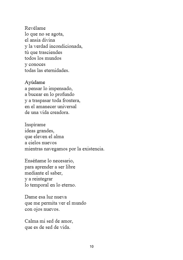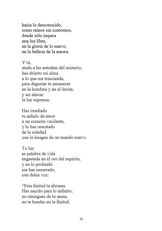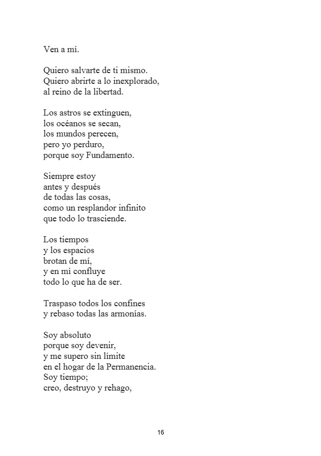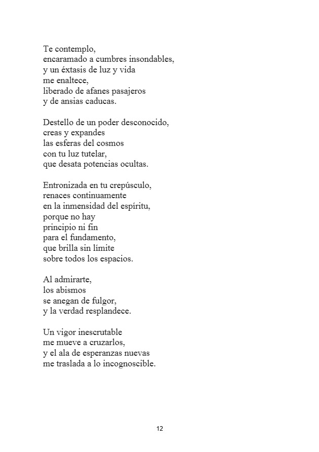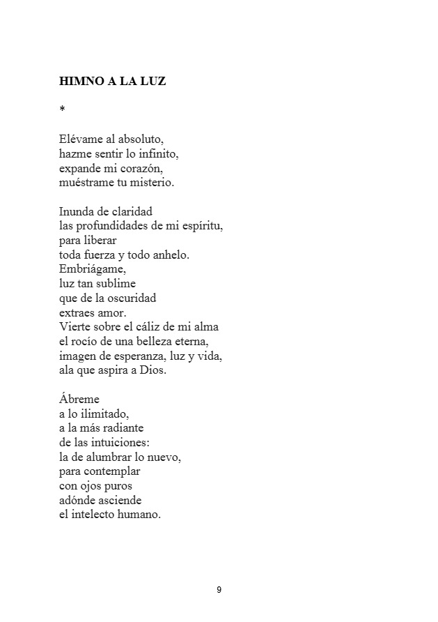 celebra monumentos arquitectónicos, paisajes naturales y civilizaciones como manifestaciones de esa luz primordial. La obra concluye con himnos abstractos dedicados a conceptos universales: Historia, Amor Verdadero, Creación y Libertad. El hilo conductor es la convicción de que la belleza artística y natural no perece con el tiempo, sino que trasciende como expresión del anhelo humano por lo infinito.