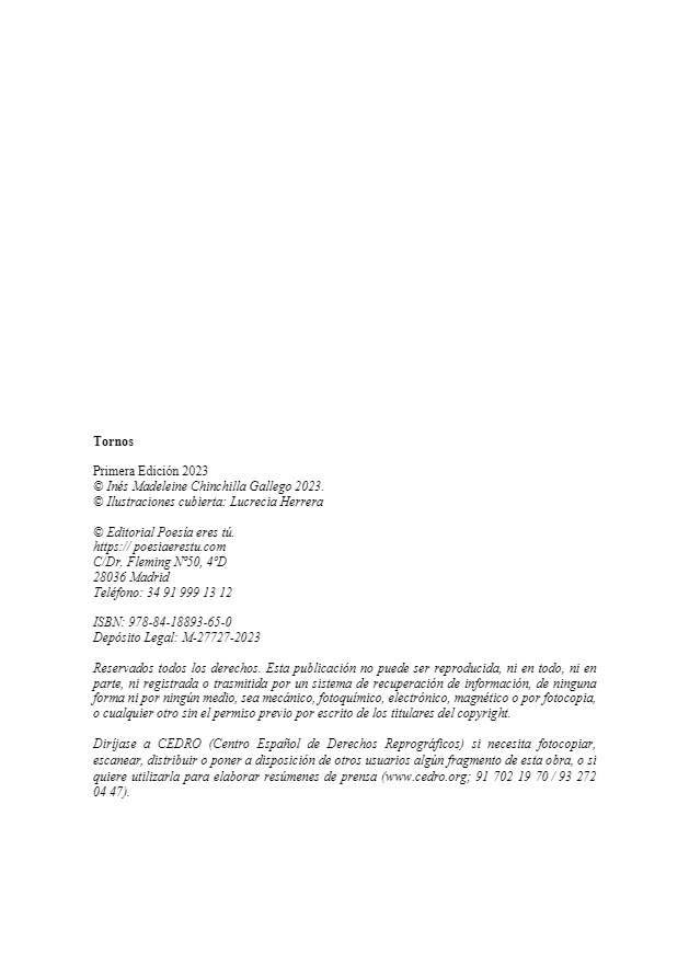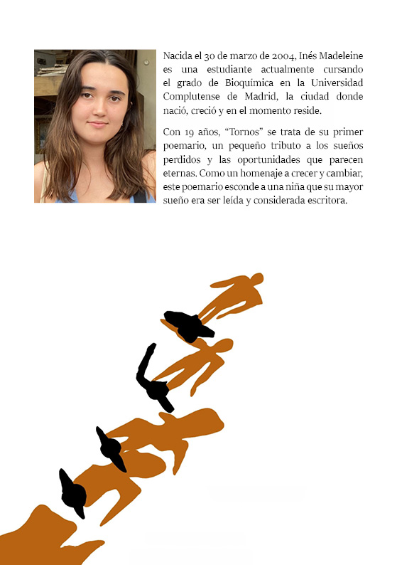 Con 19 años, “Tornos” se trata de su primer poemario, un pequeño tributo a los sueños perdidos y las oportunidades que parecen eternas. Como un homenaje a crecer y cambiar, este poemario esconde a una niña que su mayor sueño era ser leída y considerada escritora.