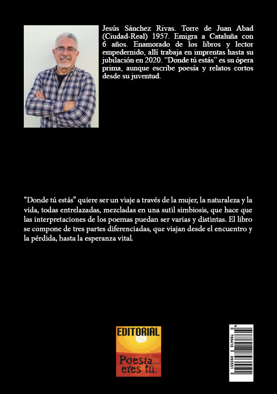Jesús Sánchez Rivas. Torre de Juan Abad (Ciudad-Real) 1957. Emigra a Cataluña con 6 años. Enamorado de los libros y lector empedernido, allí trabaja en imprentas hasta su jubilación en 2020. “Donde tú estás” es su ópera prima, aunque escribe poesía y relatos cortos desde su juventud.