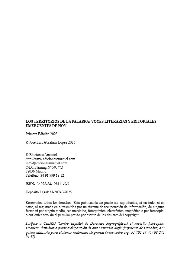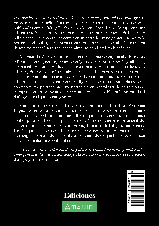 Los territorios de la palabra. Voces literarias y editoriales emergentes de hoy reúne reseñas literarias y entrevistas a escritores y editores publicadas entre 2020 y 2025 en IDEAL en Clase. Lejos de aspirar a una crítica académica, este volumen configura un mapa personal de lecturas y reflexiones. La selección se centra en un periodo breve y convulso, agitado por crisis globales, transformaciones en el sector editorial y la irrupción de nuevas voces literarias, especialmente en el ámbito hispánico.