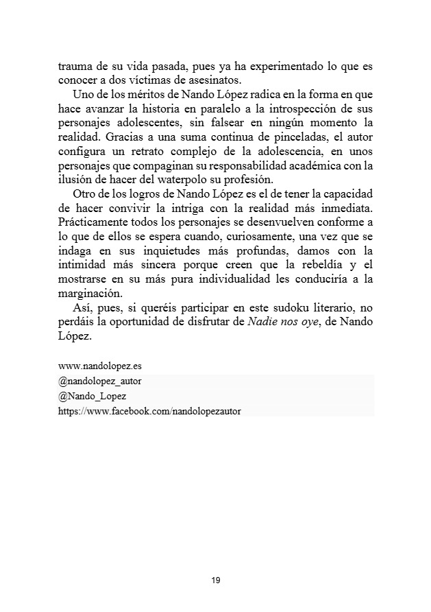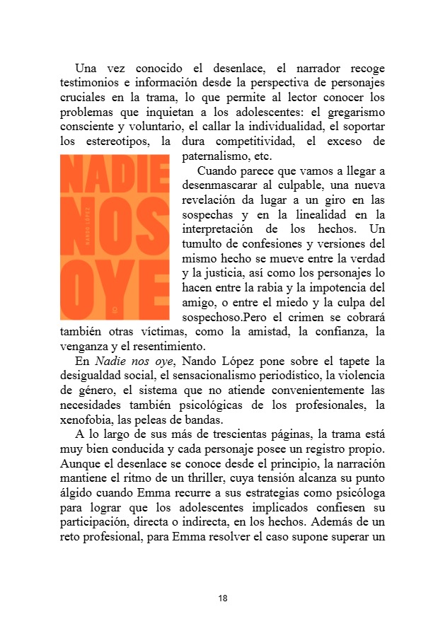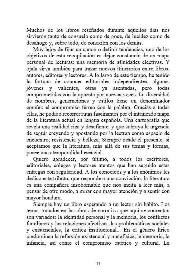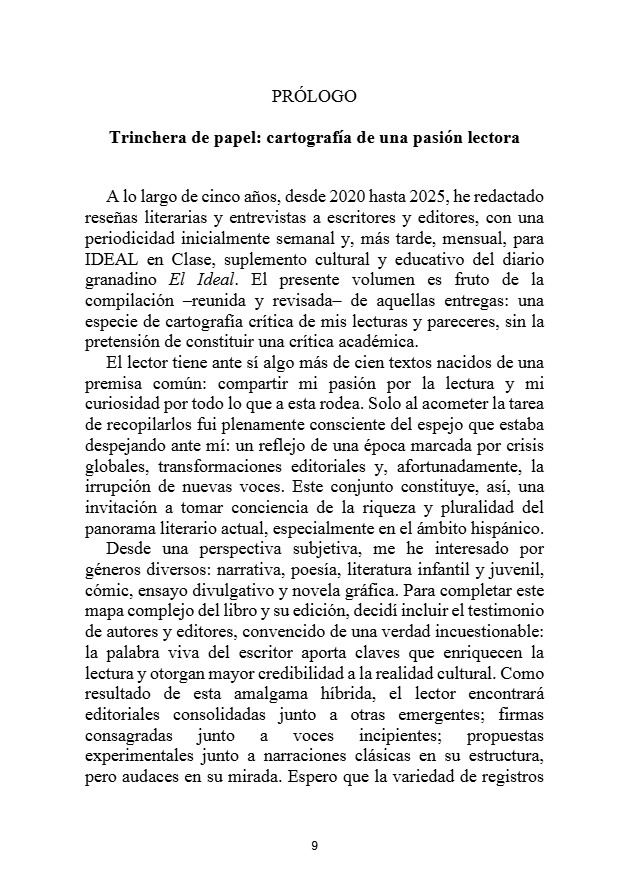 Esta obra reúne más de cien reseñas literarias y entrevistas realizadas durante cinco años (2020-2025) para el suplemento IDEAL en Clase del diario granadino El Ideal. El volumen abarca narrativa, poesía, literatura infantil y juvenil, cómic y ensayo, combinando análisis textuales con testimonios directos de autores y editores independientes. Desde la pandemia hasta la actualidad, Abraham López construye una cartografía crítica del panorama literario emergente español, defendiendo la lectura como acto de ciudadanía cultural y resistencia ante el consumo voraz de información.