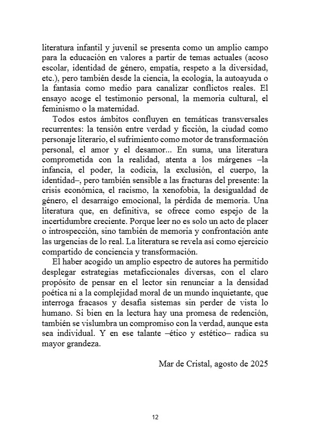 Además de abordar numerosos géneros –narrativa, poesía, literatura infantil y juvenil, cómic, ensayo divulgativo, memorias, novela gráfica…–, el presente volumen incluye declaraciones de voces de la escritura y la edición, de modo que la palabra directa de los protagonistas enriquece la experiencia de lectura. La recopilación combina la presencia de editoriales asentadas y emergentes, figuras autorales reconocidas y otras con una firme proyección, propuestas experimentales y de corte clásico, siempre con un propósito: ofrecer una crítica flexible, más orientada al diálogo que al juicio categórico.