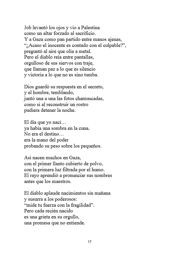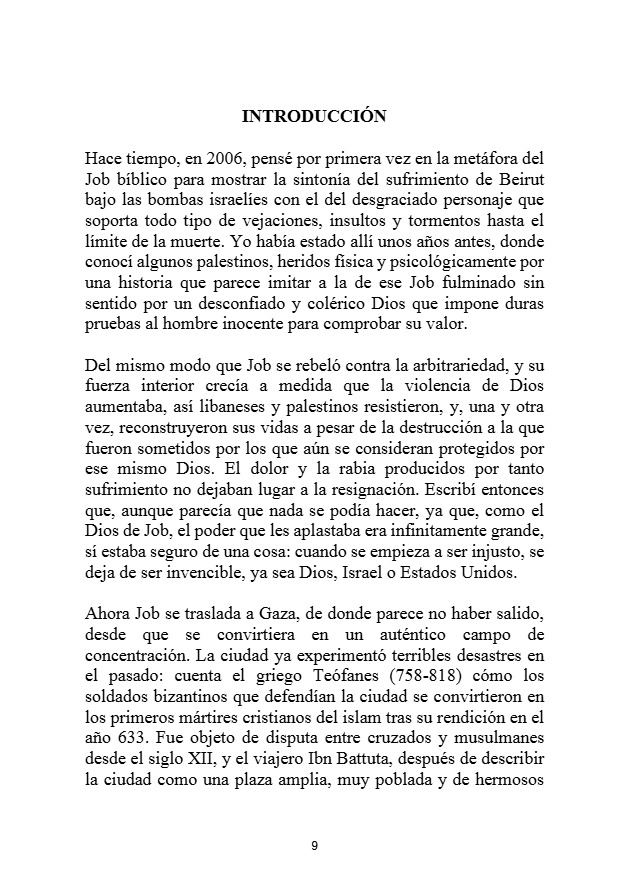 Job en Gaza es una obra poético-narrativa que reinterpreta el libro bíblico de Job para reflejar el sufrimiento del pueblo palestino, especialmente el de Gaza, sometido a la violencia y al exilio. A través de una voz que mezcla lamento, reflexión histórica y denuncia moral, el texto equipara las pruebas de Job con la devastación contemporánea de Palestina, mostrando a Gaza como el nuevo escenario del dolor inocente frente a un Dios silencioso y al poder impune de Israel. La obra avanza desde la desolación hasta una esperanza trágica, donde la memoria y la palabra se erigen en resistencia frente al olvido, cerrando con la imagen simbólica de Troya como herencia universal del sufrimiento humano.