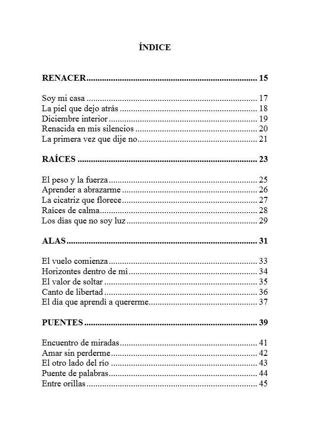 Renacida en mi calma no es una colección de poemas al azar, sino una cuidada “arquitectura narrativa del crecimiento personal”. El libro está meticulosamente estructurado en cinco secciones temáticas que funcionan como un mapa del proceso de transformación: Renacer, Raíces, Alas, Puentes y Horizontes.