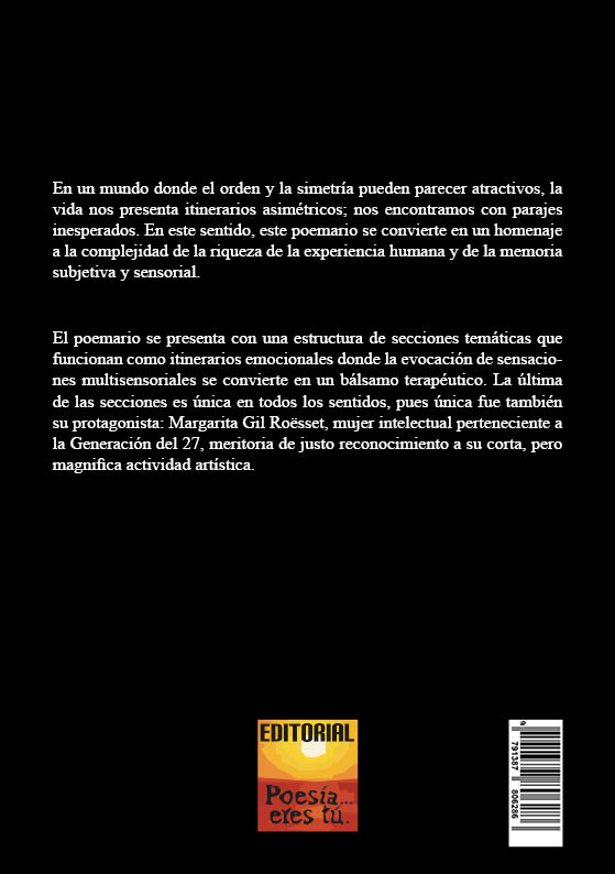En un mundo donde el orden y la simetría pueden parecer atractivos, la vida nos presenta itinerarios asimétricos; nos encontramos con parajes inesperados. En este sentido, este poemario se convierte en un homenaje a la complejidad de la riqueza de la experiencia humana y de la memoria subjetiva y sensorial.