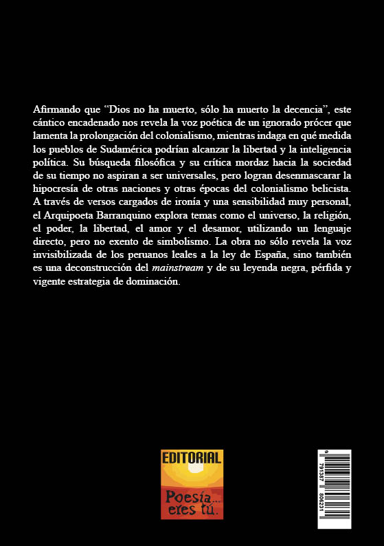 Afirmando que “Dios no ha muerto, sólo ha muerto la decencia”, este cántico encadenado nos revela la voz poética de un ignorado prócer que lamenta la prolongación del colonialismo, mientras indaga en qué medida los pueblos de Sudamérica podrían alcanzar la libertad y la inteligencia política. Su búsqueda filosófica y su crítica mordaz hacia la sociedad de su tiempo no aspiran a ser universales, pero logran desenmascarar la hipocresía de otras naciones y otras épocas del colonialismo belicista.