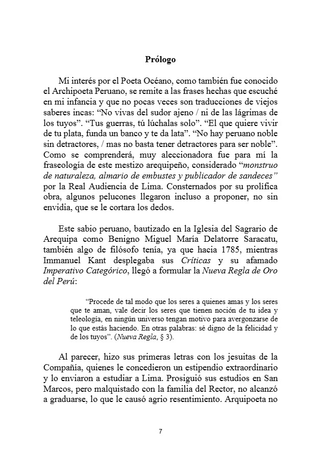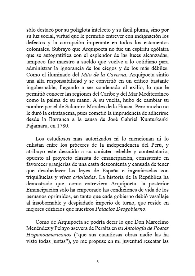 A través de versos cargados de ironía y una sensibilidad muy personal, el Arquipoeta Barranquino explora temas como el universo, la religión, el poder, la libertad, el amor y el desamor, utilizando un lenguaje directo, pero no exento de simbolismo. La obra no sólo revela la voz invisibilizada de los peruanos leales a la ley de España, sino también es una deconstrucción del mainstream y de su leyenda negra, pérfida y vigente estrategia de dominación.