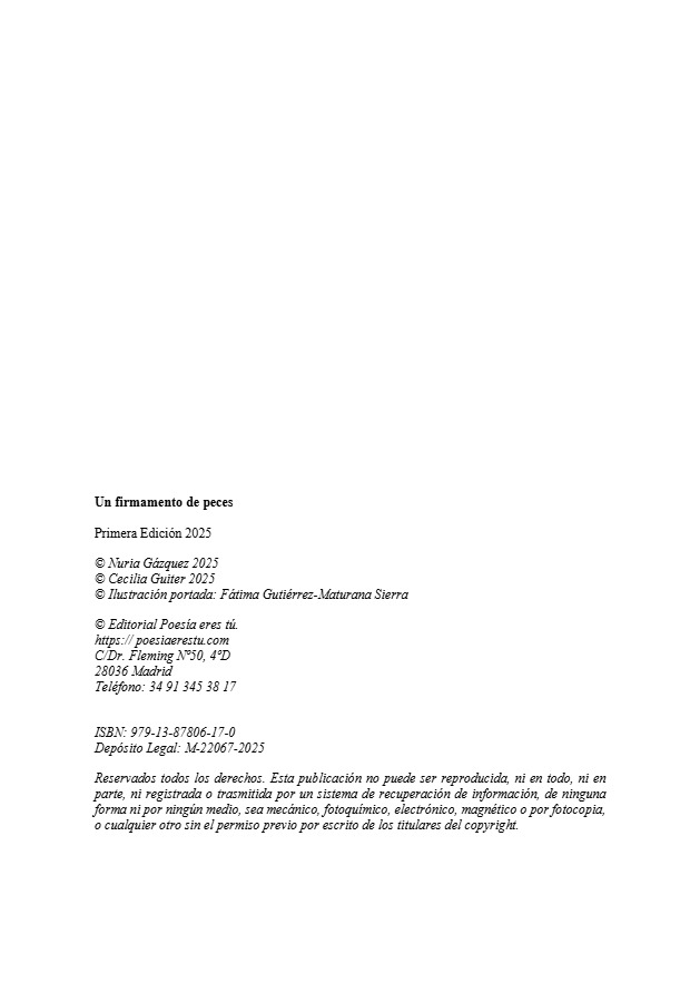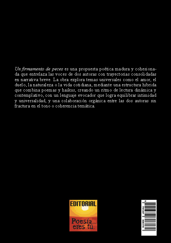 Un firmamento de peces es un poemario colaborativo que entrelaza dos voces poéticas femeninas en una exploración íntima de los grandes temas existenciales. A lo largo de sus 135 páginas, Cecilia Guiter y Nuria Gázquez construyen un diálogo poético que alterna entre poemas extensos de verso libre y haikus tradicionales, creando un ritmo respiratorio que oscila entre la expansión narrativa y la contención lírica.