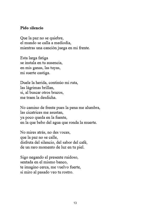 La secuencia de cierre (poemas 118-129) no ofrece resolución narrativa pero sí una síntesis temática y emocional. “Mándame un ángel” retorna al duelo pero desde una aceptación más serena. “Silencio para la tristeza” domestica la tristeza doblándola “con el baúl de la ropa”. “Tengo un amor” celebra un amor que riega flores y cultiva abrazos. “Entre líneas” cierra con la imagen del pájaro que busca amor entre páginas, metáfora perfecta del libro mismo.