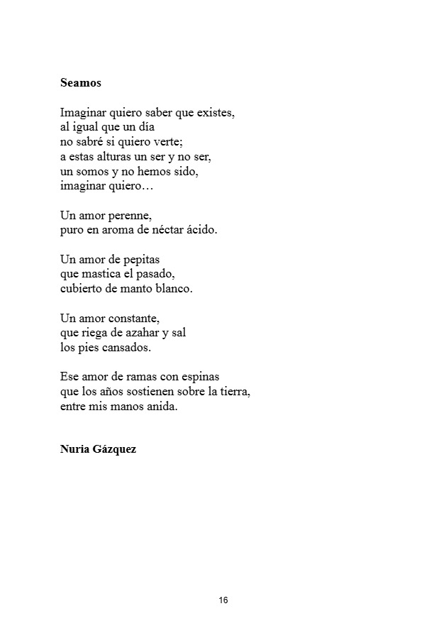 Un primer ciclo del amor presente (poemas 15-26) desarrolla la temática amorosa desde múltiples ángulos. “Seamos” lo plantea como posibilidad e imaginación. “Besos sueltos” lo ancla en gestos concretos y rituales compartidos. “Pleamar” lo eleva hacia lo cósmico, el diálogo entre luna y mar como reflejo del amor humano.
