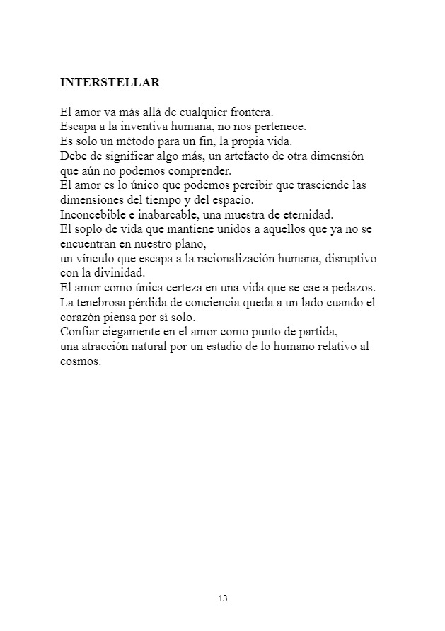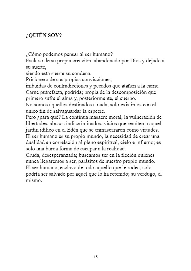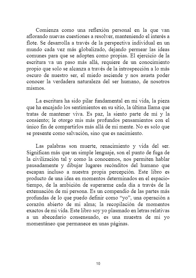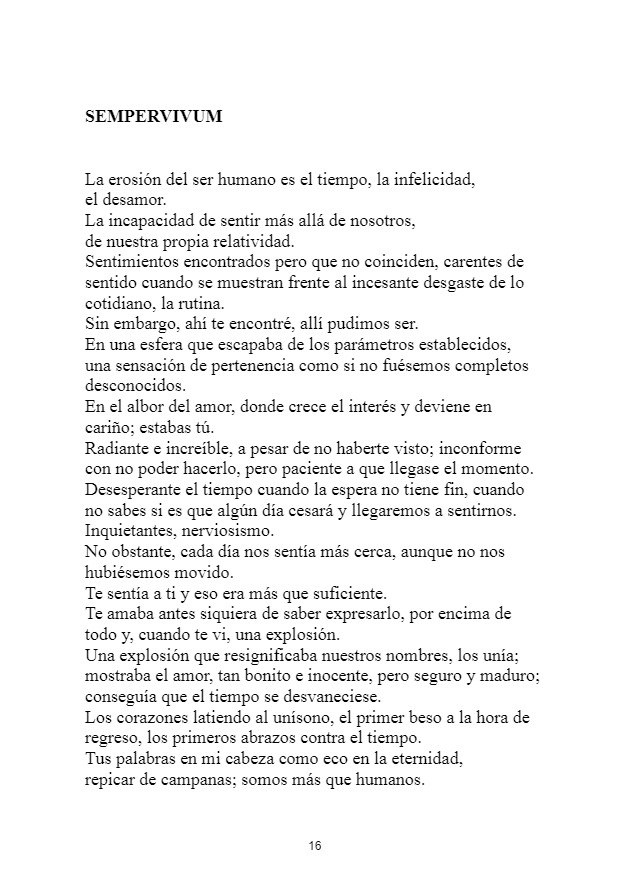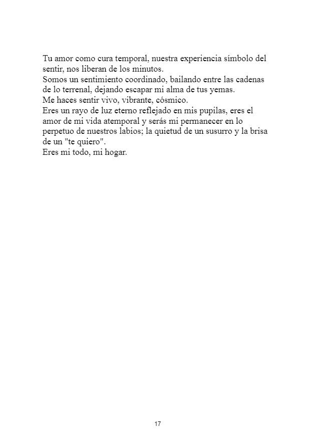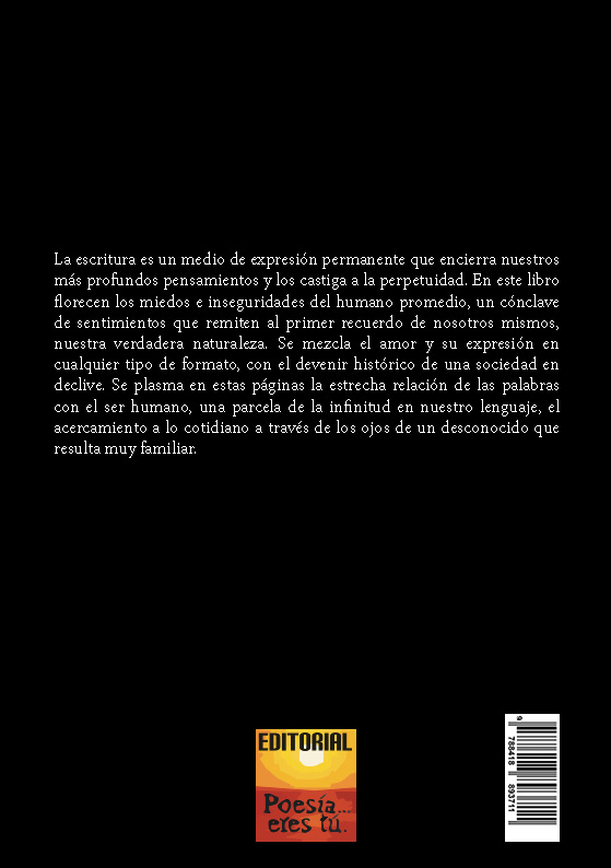 La escritura es un medio de expresión permanente que encierra nuestros más profundos pensamientos y los castiga a la perpetuidad. En este libro florecen los miedos e inseguridades del humano promedio, un cónclave de sentimientos que remiten al primer recuerdo de nosotros mismos, nuestra verdadera naturaleza. Se mezcla el amor y su expresión en cualquier tipo de formato, con el devenir histórico de una sociedad en declive. Se plasma en estas páginas la estrecha relación de las palabras con el ser humano, una parcela de la infinitud en nuestro lenguaje, el acercamiento a lo cotidiano a través de los ojos de un desconocido que resulta muy familiar.
