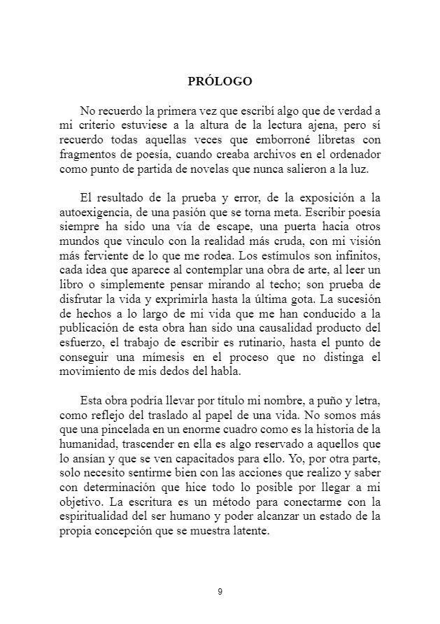 Ya en su infancia la lectura lo cautivó haciendo que devorara libros desde muy temprana edad. Los documentos que nombraba en el ordenador rellenando solamente unas páginas serían sus primeras "novelas". Sin embargo, no fue hasta la adolescencia cuando se decantó por la poesía y comenzó a escribir de una forma más habituada. Este libro de prosa poética es el culmen de la primera parte de una vida, un comienzo del camino de la escritura que ya se inició hace tiempo.